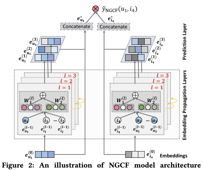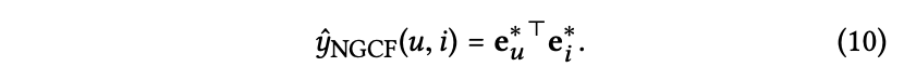 반면에 NGCF는 ID 임베딩을 초기값으로 사용하고 수정한 뒤 예측값을 구한다.