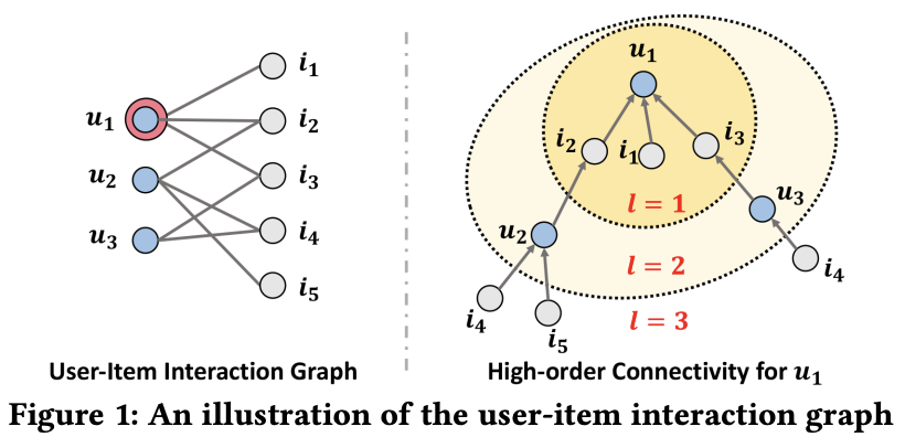 Fig 1은 유저-아이템 인터랙션 그래프와 high-order connectivity를 보여준다.