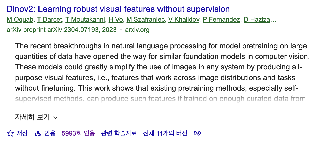 아까 찾은 DINO v2 이 모델은 2024 SOTA 모델이다.