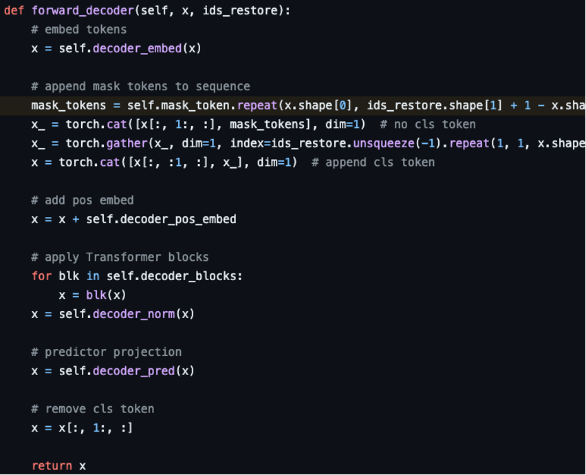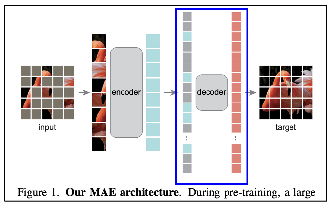 따라서 저자들은 마스크 토큰을 인코더에서는 안넣고 효율적으로 학습했다.