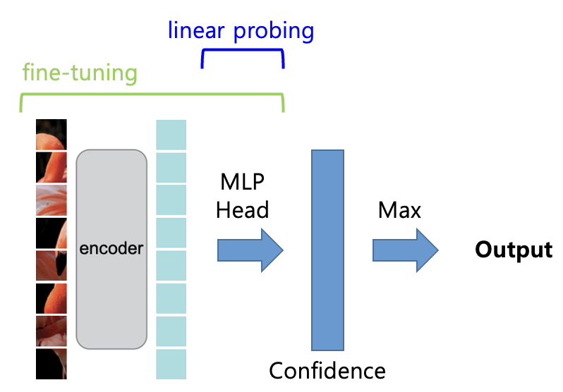 linear probing은 사전 학습된 인코더의 웨이트는 고정하고 MLP 헤드만 학습하는 것이다.