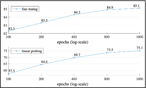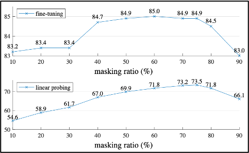 마스킹 비율은 75%가 fine-tuning과 linear probing 모두에서 가장 좋았다.