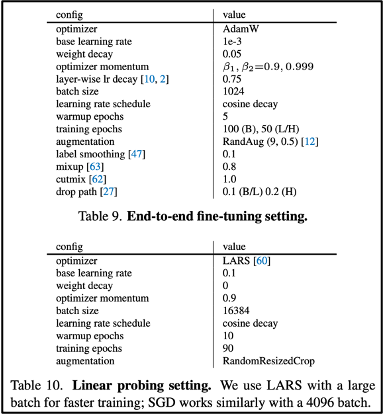 fine-tuning과 linear probing은 별도의 레시피를 사용한다.
