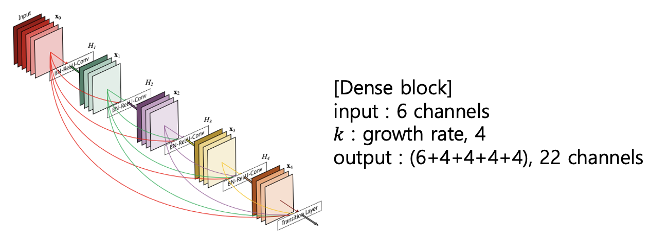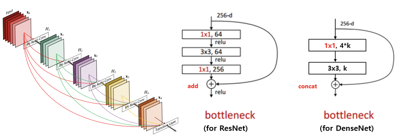 반면 DenseNet은 Concat을 하므로 shape 중 가로 세로만 같으면 되고 채널은 달라도 된다.