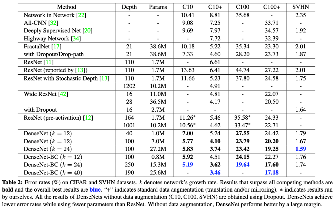 FractalNet과 비교하면 파라미터 수에 비해 정확도가 높다. (효율적이다)