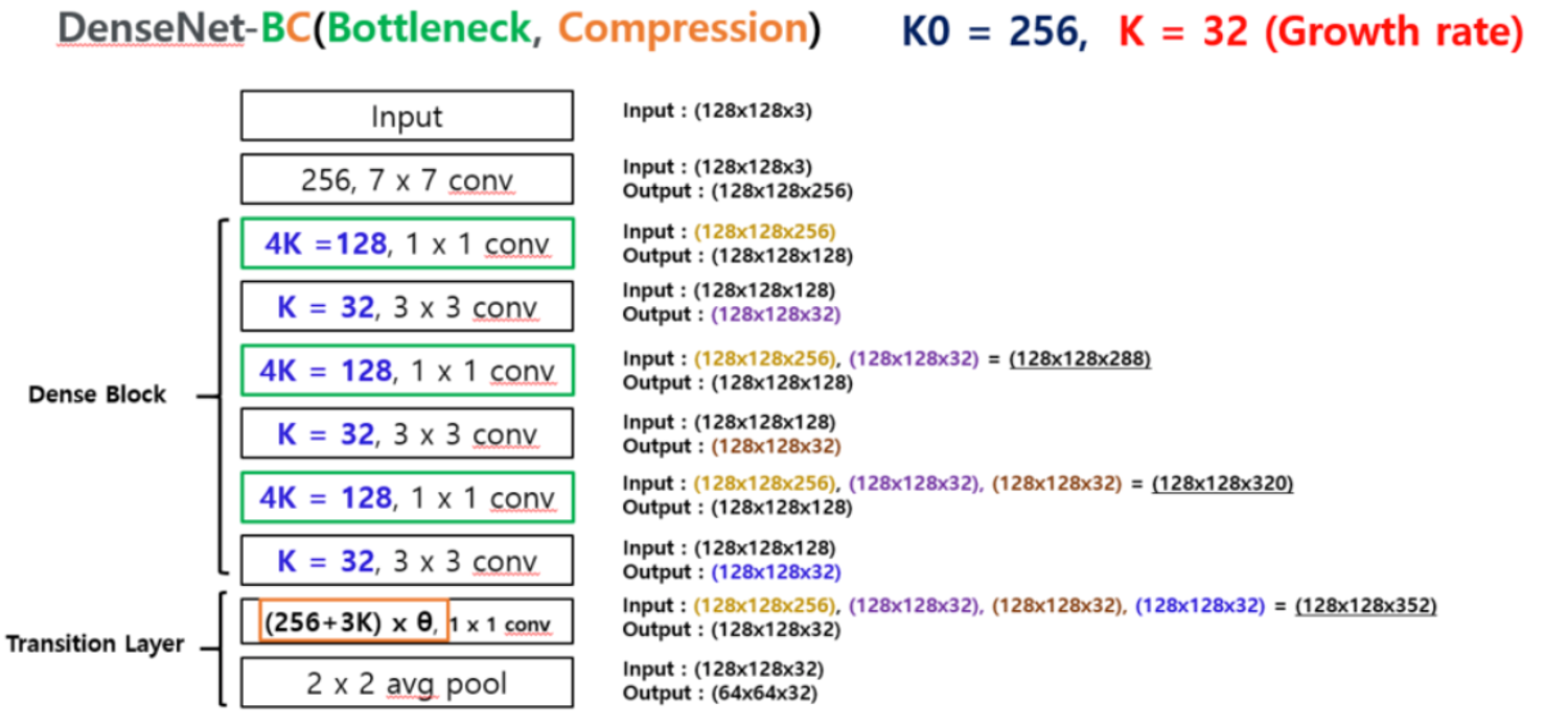 작은블럭은 (128, 1x1 Conv), (32, 3x3 Conv), concatenate 이다.