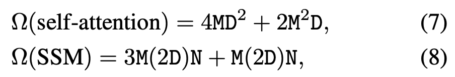 셀프 어텐션 레이어와 SSM의 계산 복잡도는 (7), (8) 이다.