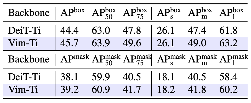 DeiT와 비교 : AP box와 AP mask 모두 좋은 성능.
