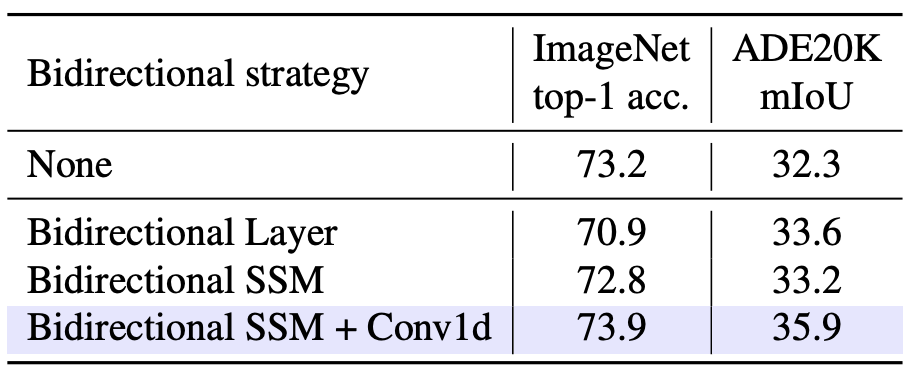 Bidirectional SSM 빼면 성능이 드랍된다.