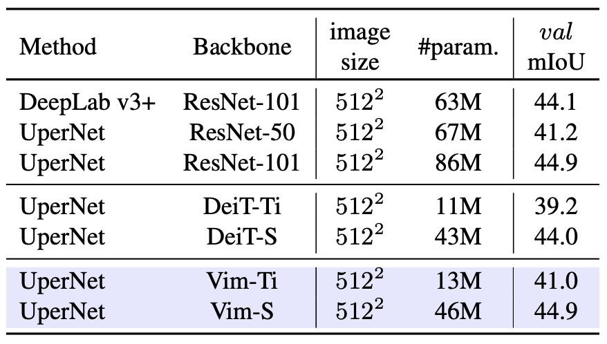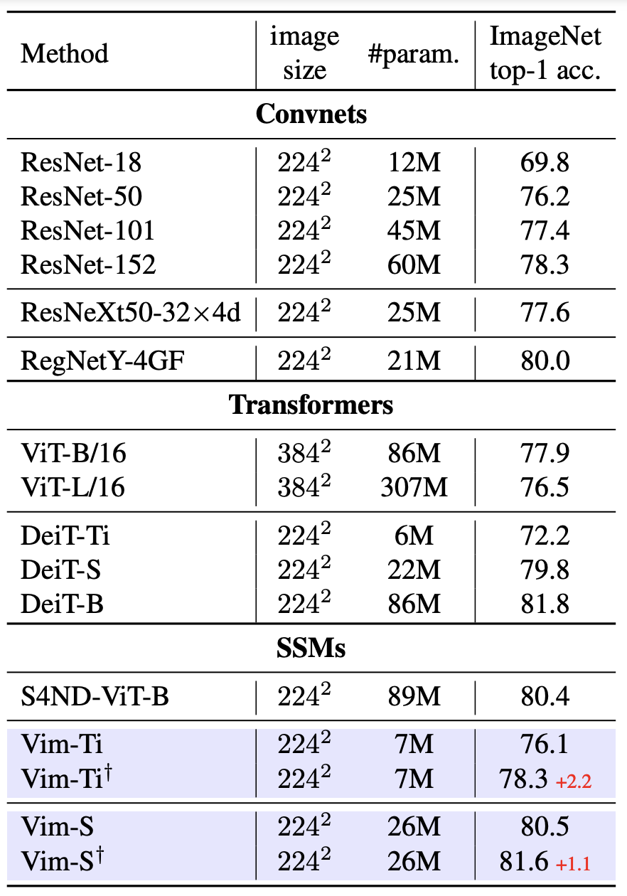 CNN과 비교 : 비슷한 사이즈 Res50과 Vim-S 4.3% 높다.
