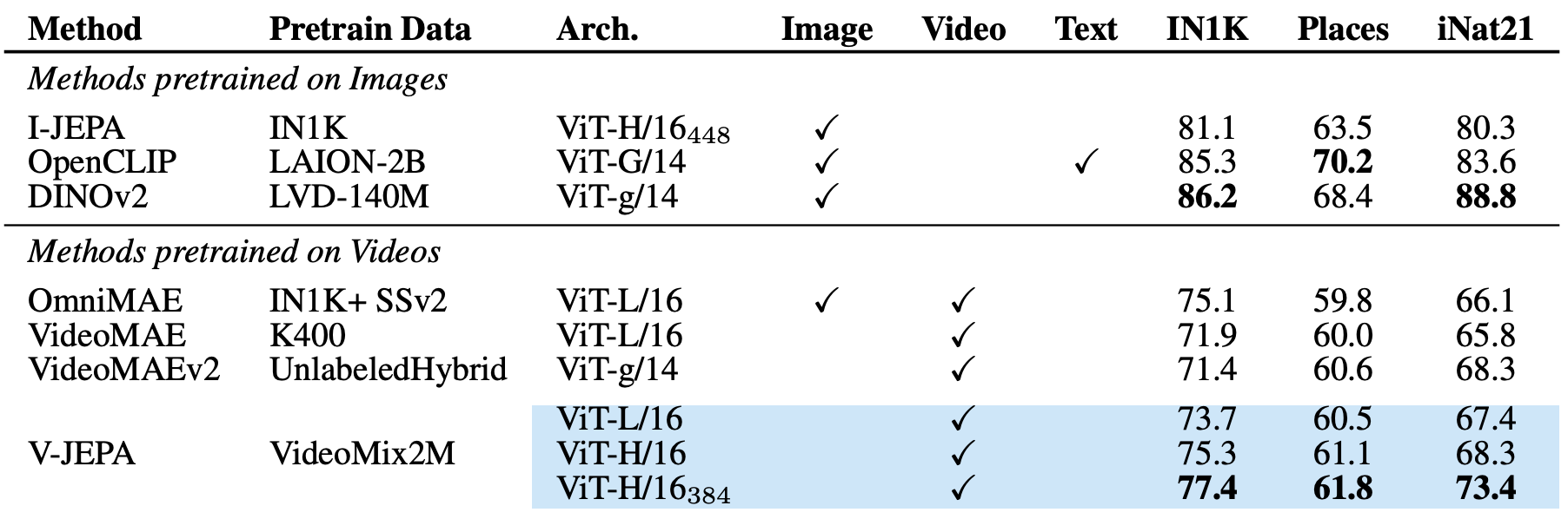V-JEPA가 기존 이미지 best 모델(DINOv2)에 근접했다.
