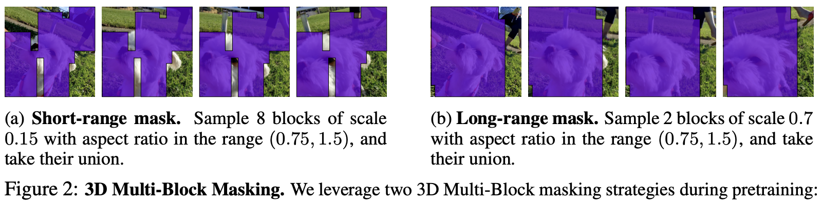 V-JEPA에서는 2가지 마스크(short-range, long-range)를 사용한다.