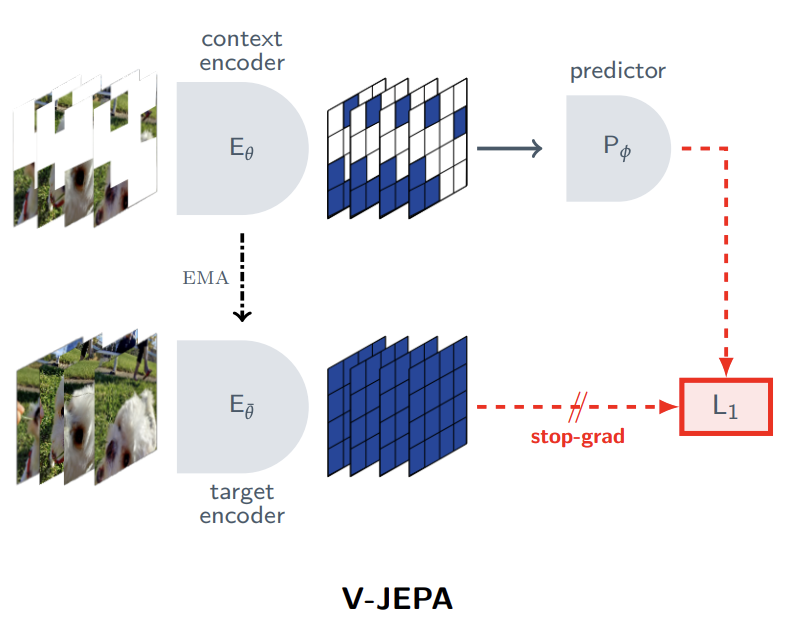 저자들은 이 아키텍처를 비디오와 마스킹에 적용해 V-JEPA를 구상했다.