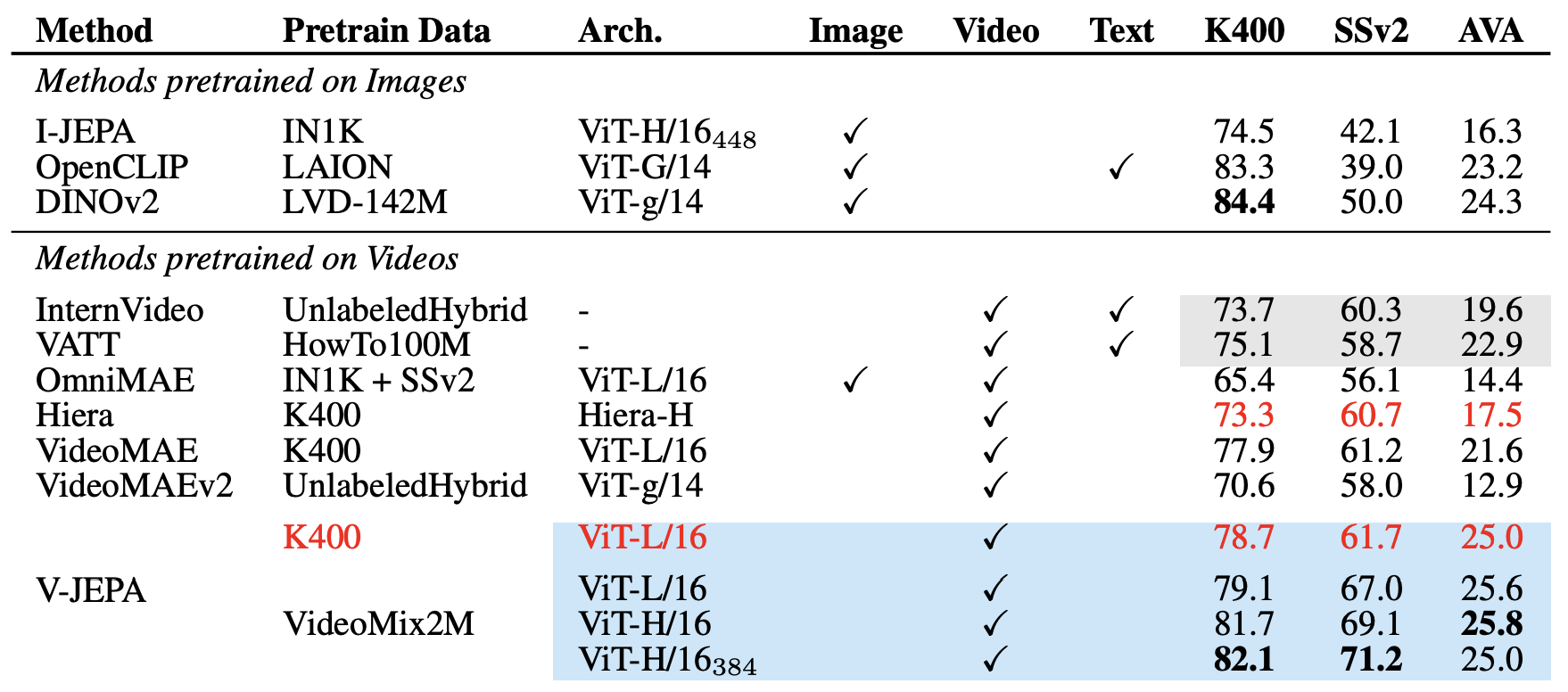 V-JEPA의 ViT-H/16 384 모델이 기존 비디오 best 모델(InternVideo) 보다 성능이 좋다.
