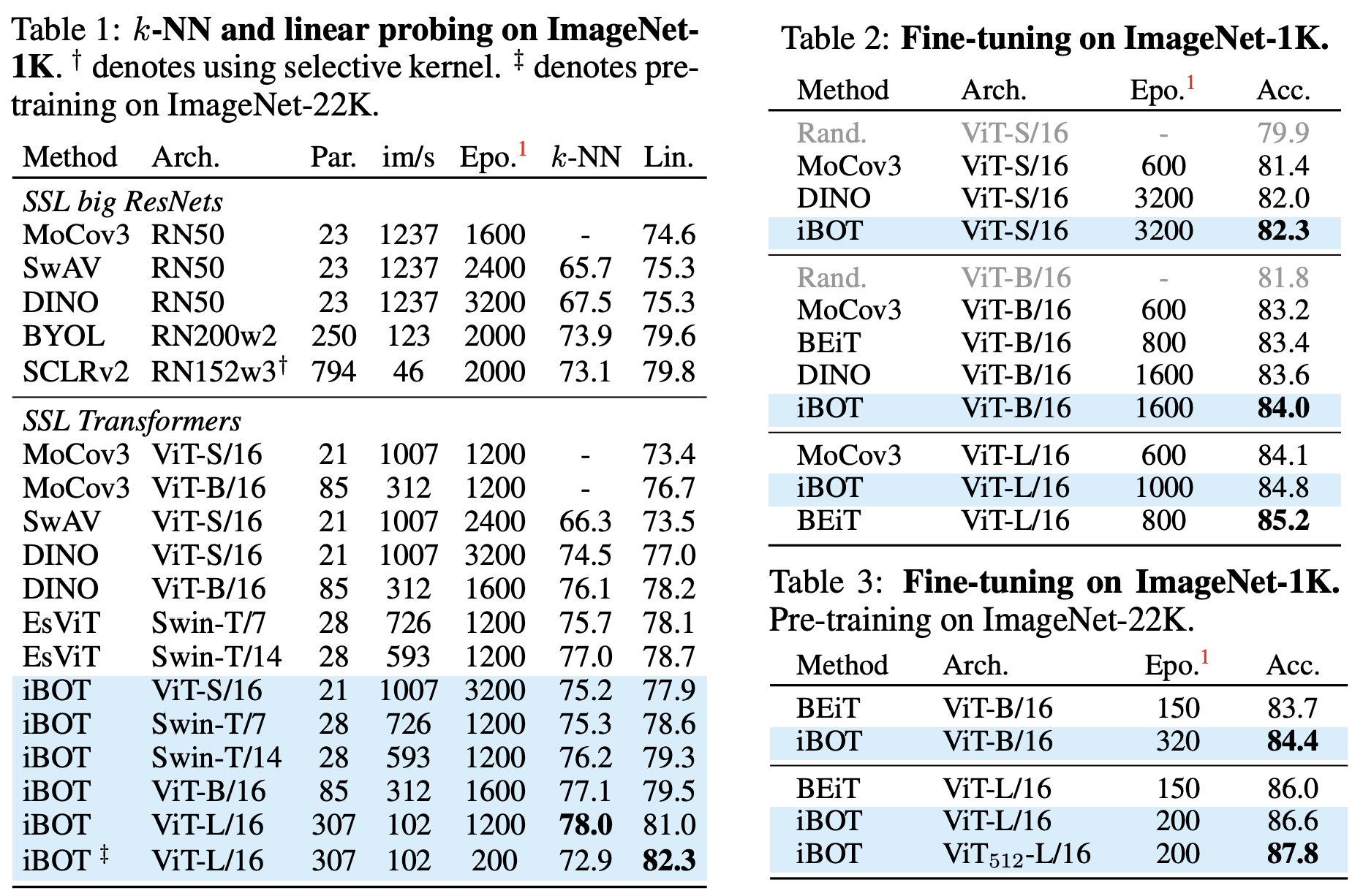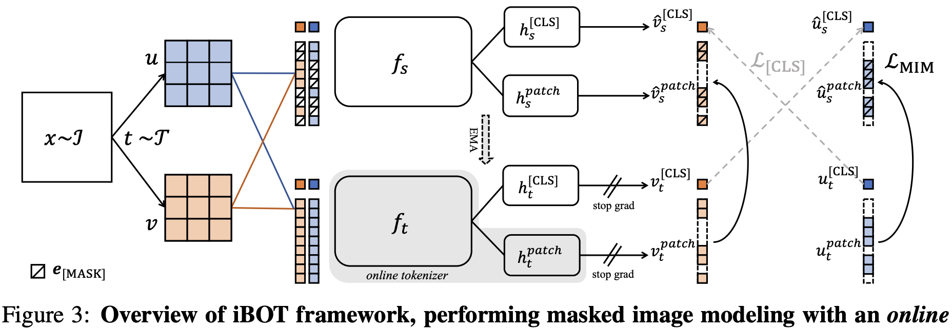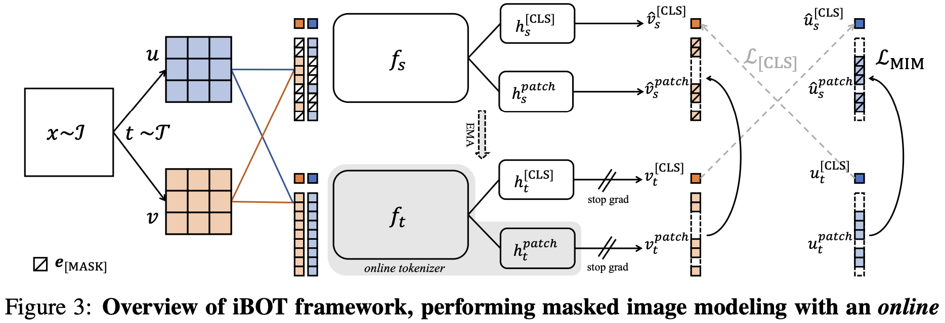 online tokenizer를 사용한 self-supervised 프레임워크 iBOT를 제시한다.