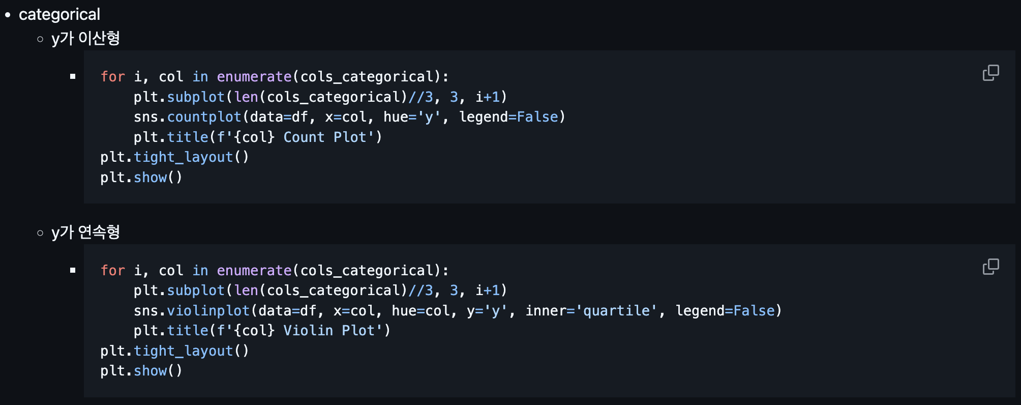 위 예시를 보면 카테고리컬에 y의 이산형/연속형에 따라 코드를 작성했다.