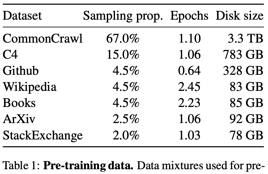LLaMA는 이 사전학습에 오픈소스 데이터셋만 사용했고 7종을 섞어서 사용했다.