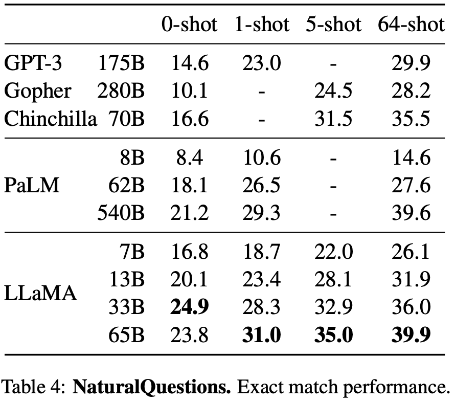 특이한 점은 NaturalQuestions 0 shot에서 33B가 성능이 더 좋다.
