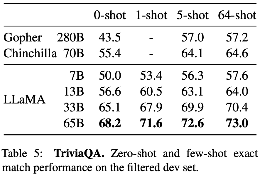 65B가 0 shot, few shot 평가에서 SOTA를 달성했다.